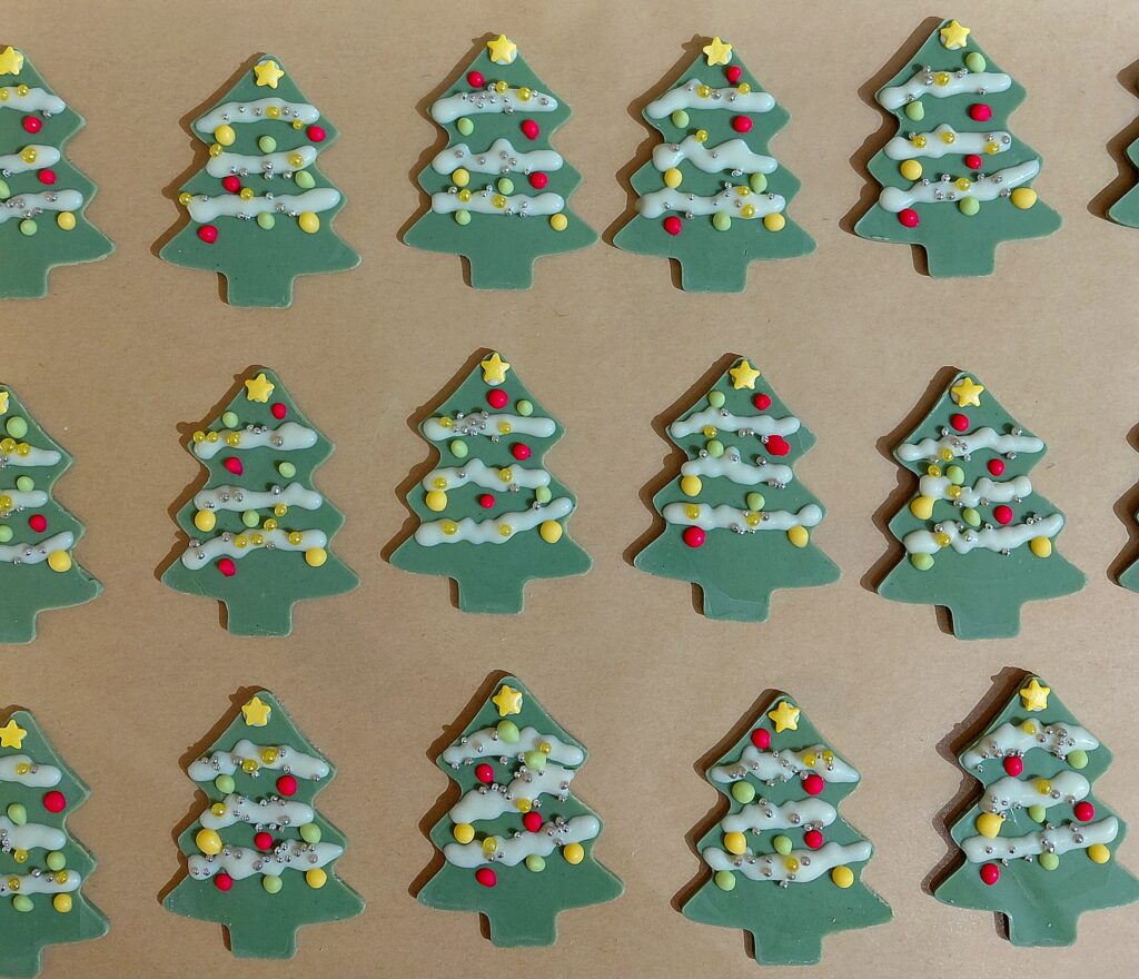 今年もツリーチョコ作りました。ホワイトチョコにカカオバターの色素で色付けしました。アラザンをくっ付けてカラーチョコで模様にしています。ザクザクしていて楽しい食感です。